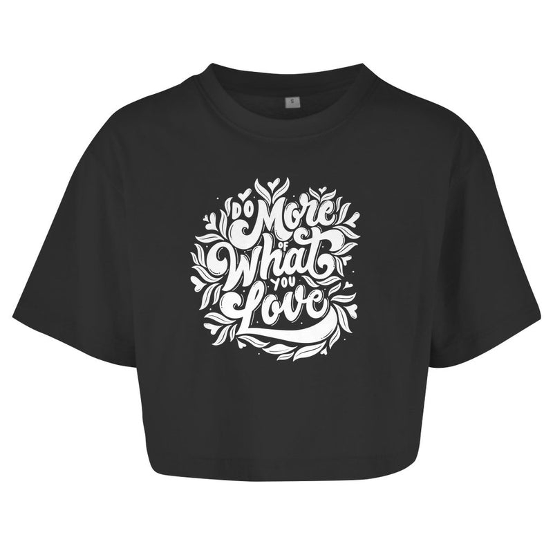 Das Damen Oversize Crop Top 'Do more what you love' ist ein sportives und sommerliches T-Shirt mit einem bauchfreien Schnitt, einer legeren Oversize Passform und kurzen, weiten Ärmeln. Der Rundhalsausschnitt rundet das Gesamtbild stimmig ab. Das T-Shirt besteht aus weicher Baumwolle und bietet somit einen angenehmen Tragekomfort. Mit seinem lässigen und trendigen Design ist es perfekt für warme Tage und lässt sich vielseitig kombinieren. Die Materialzusammensetzung besteht zu 100% aus Baumwolle, was für eine hohe Qualität und Langlebigkeit des Produkts sorgt.