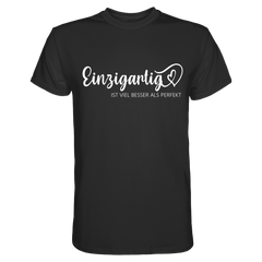 Der gerade Fit bietet ein angenehmes Tragegefühl und macht das Shirt vielseitig kombinierbar. Der inspirierende Aufdruck „Einzigartig ist viel besser als perfekt“ erinnert daran, dass Persönlichkeit mehr zählt als Perfektion.