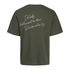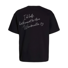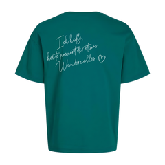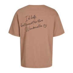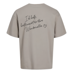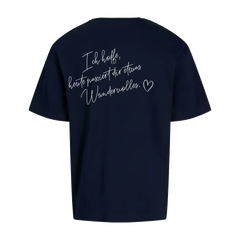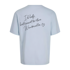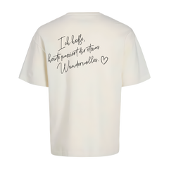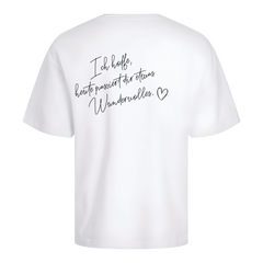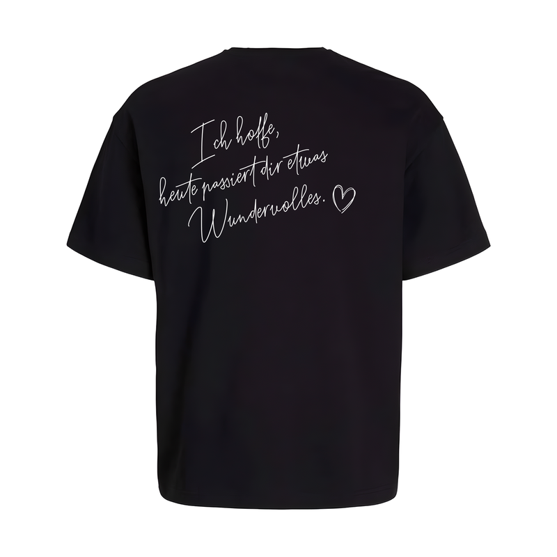 Dieses oversize T Shirt trägt eine liebevolle Botschaft auf dem Rücken: „Ich hoffe, heute passiert dir etwas Wundervolles.“ Ein Satz, der Mut macht, Hoffnung schenkt und Menschen im Alltag ein kleines Lächeln ins Gesicht zaubern kann.