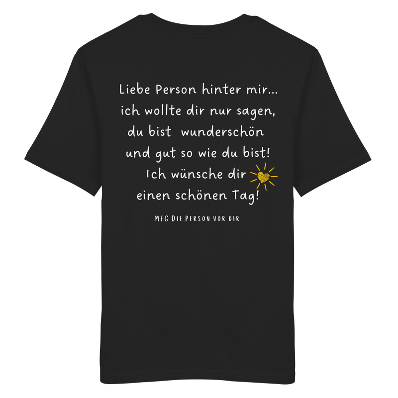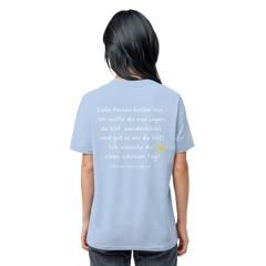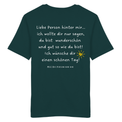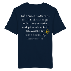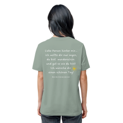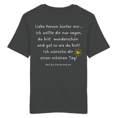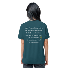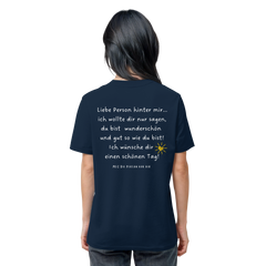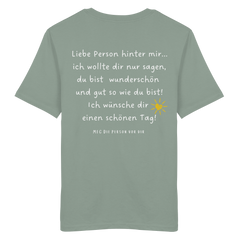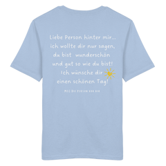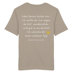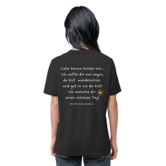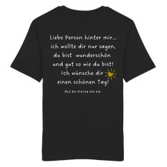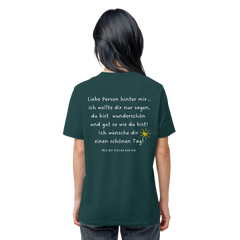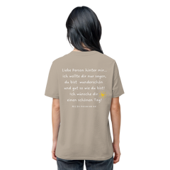 Der Rückendruck mit der sonnigen Botschaft „Liebe Person hinter mir, ich wünsche dir einen wundervollen Tag“ ist wie eine kleine Umarmung aus Stoff.