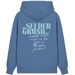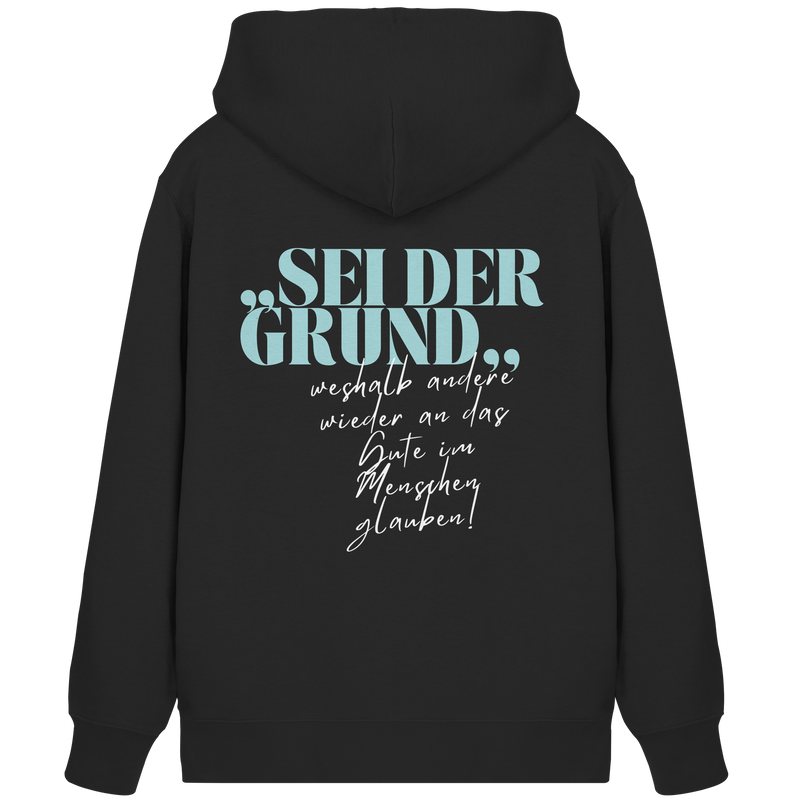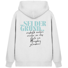 Mit seiner Grammatur von 300 g/m² hat er genau die richtige Stärke – warm, aber nicht schwer. Die eigenstoff-gefütterte Kapuze, der verdeckte Metallreißverschluss und die runde Kordel mit Metallenden sorgen für einen sauberen, modernen Look.
