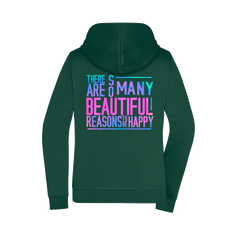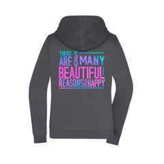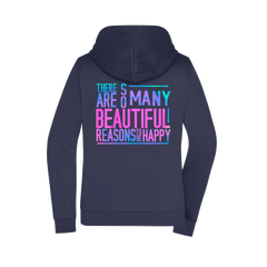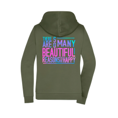 Der ausdrucksstarke Rückenprint „There are so many beautiful reasons to be happy“ setzt ein bewusstes Statement für Optimismus und Lebensfreude – klar, ruhig und inspirierend. Die dezente Front bleibt clean und macht die Jacke vielseitig kombinierbar.