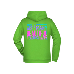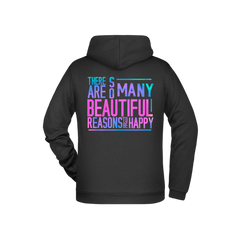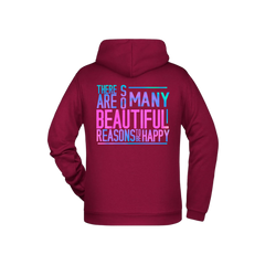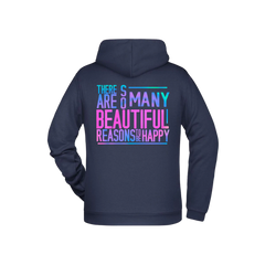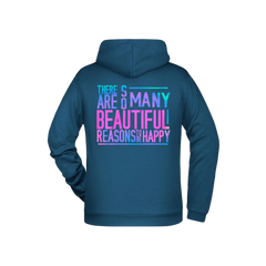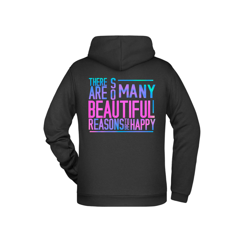 Der Rückenprint „There are so many beautiful reasons to be happy“ setzt ein positives Statement, ohne aufdringlich zu wirken.